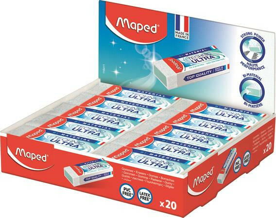Radír display, papírtokkal, 20 db, MAPED "Technic Ultra" extra hatékonyságú, prémium minőségű radír papírtokkal otthoni, irodai, iskolai használatra nem morzsolódik PVC-mentes méret: 21,5 x 12 x 61 mmAlcsoportdisplayUtántölthetőNemHíg íthatóNemOldószeresNemRadír típusaceruzaPVC-mentesIgenRadír borításapapírtokRadírhosszúság61 mmRadírszélesség21.5 mmRadírmagasság1