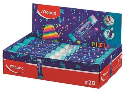 Termék részletekA Maped "Pixel Party" kollekciójával egy retro-futurisztikus környezetbe csöppenhetünk, mely fiúknak és lányoknak egyaránt vonzó világot jelent. -hatékony és praktikus radír, mely tiszta marad a tolltartóban is -csavaró mechanizmusával könnyen használható - akár egy ragasztóstift -trendi mintája magával ragadó -PVC- és ftalátmentes