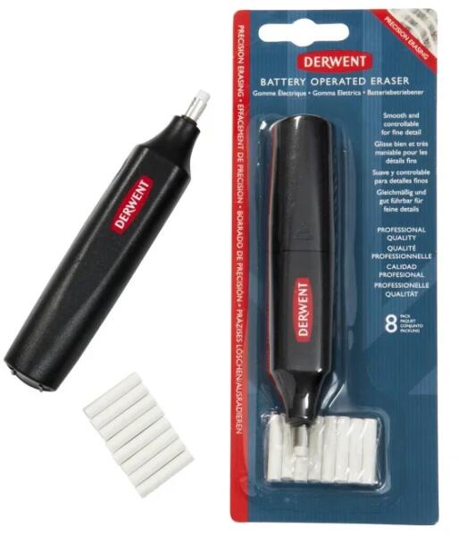 Derwent elemes radír precíziós + 8 db pótradírElemmel működő radír Precíziós és gyors radírozáshoz, javításokhoz. Használható grafit-, színes- és szénceruza rajzokhoz is. A csomag tartalmaz 8db pótradírt. Két darab AAA elemmel működik. Az elektromos radírok kis területről is könnyen vissza tudnak radírozni több réteget.