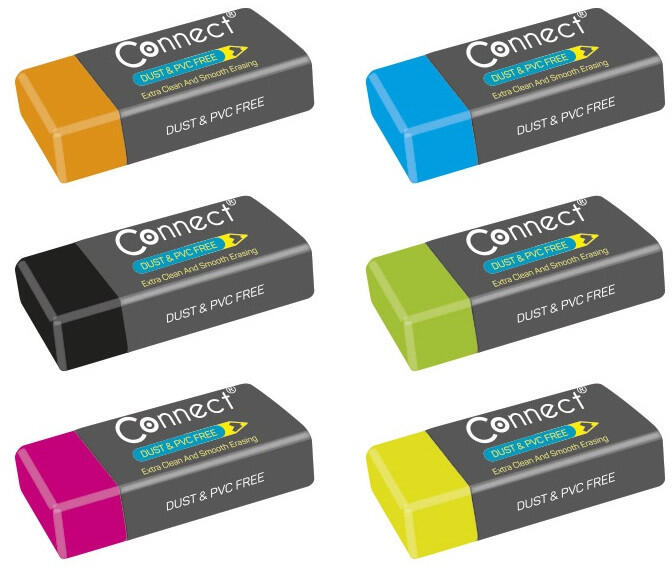 Radír Connect plasztik, 36 db/kínáló doboz 6x6szín, Szintetikus radír 6 különböző színben: fekete, rózsaszín, narancs, kék, zöld, sárga. PVC mentes. Forgács mentes. 36 db/kínáló doboz. Katalóguskód: 23328