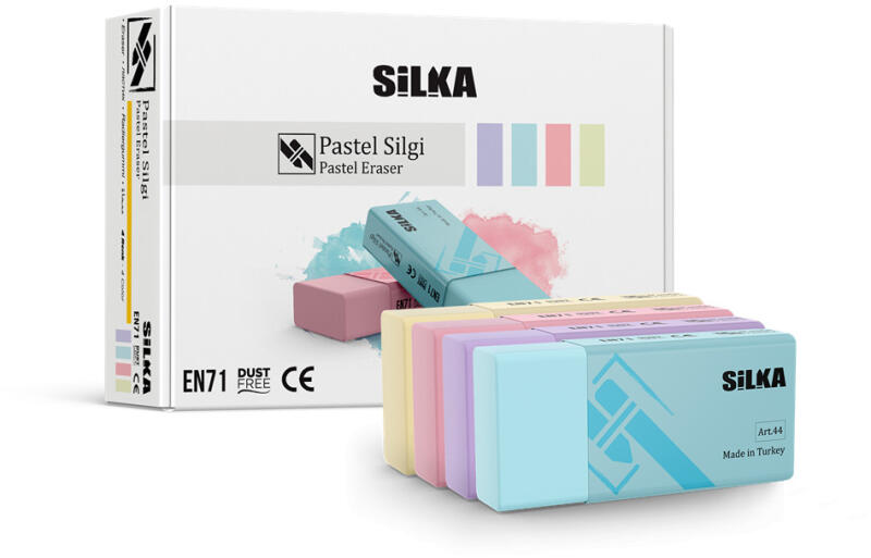 RADÍR, PASZTELL, 24 DB/DISPLAY SILKA Pasztell színű radír papír tokban. Hőre lágyuló gumiból készült, PVC és forgácsmentes. Élelmiszer minőségű festékanyagokkal gyártva. Ideális grafitceruza vonalak radírozásához. Radír mérete: 44x22x13,5 mm, 24 db/display Katalóguskód: 55690