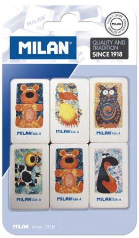 6 x négyszögletes gumi puha szintetikus gumiból. Sokféle grafitceruza vonás törlésére használható minden típusú papírról. Különféle gyerekmintákkal. Gumi mérete: 39 x 23 x 13 mm.