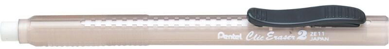 Radírceruza tolóbetétes fekete ZE11-A Pentel Tolóbetétes radír áttetsző, műanyag tollformájú testben. A radír műanyag klipsszel rendelkezik, melynek köszönhetően könnyen elhelyezhető. A termék négy színben kapható. Utántölthető. Katalóguskód: 27099