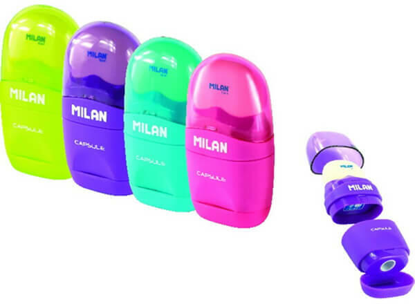 Igazán különleges egylyukú hegyező és radír egyben, ováils formájú szétszedhető műanyag tokban. Kényelmesen használható iskolában is. Radírja cserélhető (Milan 430). Minőségi spanyol MILAN márka. 4 színben rendelhető (rózsaszín, világoskék, zöld, lila), az ár 1 darabra vonatkozik. A lenyíló ablakba választható ki az elérhető szín.