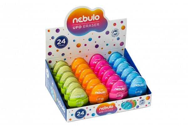 Nebulo UFO radír Radír színes, ergonomikus műanyag tokban, mely mindkét oldalról nyitható. Ideális ceruzavonalak radírozásához. PVC mentes, nem tartalmaz egészségre káros anyagot. A műanyag tok megakadályozza a radír koszolódását és kényelmes fogást biztosít.