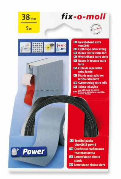 Fix-o-moll szövet ragasztószalag, erősített kivitel javításhoz, barkácsoláshoz, dekoráláshoz. Szatén felület, finom szerkezetű, erős szövetanyagból. Feliratozható. Szín: fekete Hosszúság: 5 m Szélesség: 38 mm