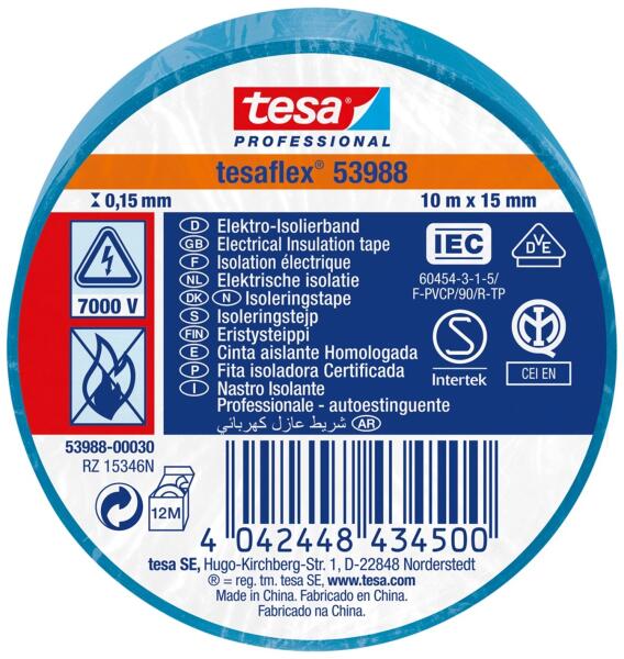 Kiváló minőségű elektromos szigetelőszalag kék színben, ami önkioltó anyaga segítségével megakadályozza az elektormos tüzek elterjedését a betekert vezetéken. Megbízható védelmet nyújt kábelek szigeteléséhez, kötegeléséhez és rögzítéséhez.