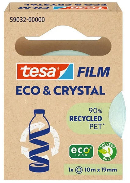 Tesa 59032 Eco&Crystal 10m x 19mm ragasztószalag A Tesa Eco&Crystal erős ragasztási teljesítményt nyújt, miközben teljesen átlátszó. A szalag kiemelkedik a minőségével és progresszív gyártási folyamatával. Háttéranyaga 90%-ban újrahasznosított PET-palackokból készül. A tekercs magja 100%-ban újrahasznosított műanyagból készül. A ragasztószalag szakadásáll