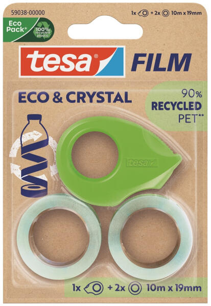 Ragasztószalag 19mmx10m irodai újrahasznosított 2 db víztiszta szalag+adagoló Tesa Eco & Crystal Bemutatjuk a tesafilm® Eco & Crystal szalagot, amely a klasszikus tesafilm® jól ismert tulajdonságait ötvözi a környezetbarát jellemzőkkel. Rendkívül átlátszó, sokoldalú, erős, oldószermentes ragasztóval, és 90%-ban PET-palackok újrahasznosításából származó műany
