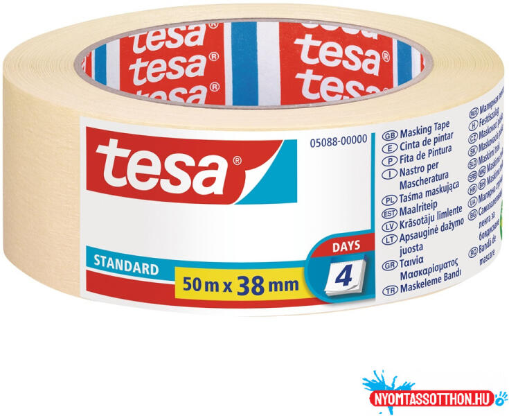 Maszkolószalag 38mmx50m Tesa 48tekercs/karton. Festőszalag. A NOPI® 4349 enyhén kreppelt általános célú papírszalag természetes gumi ragasztóanyaggal. Hátlap anyaga enyhén kreppelt papír. Teljes vastagság 110 m Ragasztóanyag típusa természetes gumi Tapadás acélhoz 2 N/cm Tapadás durva felületekhez 0,6 N/cm Szakadási nyúlás 10 % Szakítószilárdság 33 N/cm Letekercselési