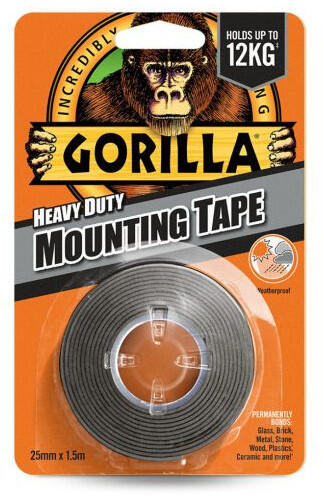 GORILLA Kétoldalas ragasztószalag kültéri fekete 25,4 mm x 1,52 m Gorilla Heavy Duty Mounting Black Tape „A földkerekség legkeményebb munkáihozFekete Kétoldalas Ragasztószalag2,54 cm x 1,52 mVíz és időjárásálló. Elképesztően erős, azonnali tapadás, tartós élettartam. Strapabíró minden időjárási helyzetben, ellenáll a nedvességnek, UV sugárzásnakés a szélsősége
