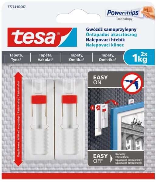 A tesa tapétán, vakolaton és festett falon használható, 1 kg teherbírású állítható öntapadós akasztószögei ideális megoldást nyújtanak képek, polcok és dekorációs elemek érzékeny felületekre történő felakasztására, fúró és kalapács, valamint a felületek megrongálása nélkül. Egy akasztószög könnyen megtart akár 1 kg súlyt is, két akasztószög teherbír
