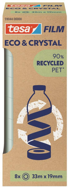 Bemutatjuk a tesafilm® Eco & Crystal szalagot, amely a klasszikus tesafilm® jól ismert tulajdonságait ötvözi a környezetbarát jellemzőkkel. Rendkívül átlátszó, sokoldalú, erős, oldószermentes ragasztóval, és 90%-ban PET-palackok újrahasznosításából származó műanyagból készült hordozóanyaggal. Ezenkívül a tekercs magja 100%-ban újrahasznosított műanyagból k