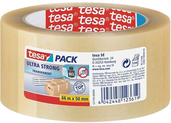 Tesa 57176 50mmx66 m ultraerős átlátszó csomagzáró szalag Nagy szakítószilárdságú PVC-hordozó A természetes gumiragasztó kitűnő tapadást biztosít Biztonságos lezárás Nehéz tárgyak csomagolásához és összekötéséhez Egyenletes, halk letekercselés Használja ezt a rendkívül szakadásálló csomagolószalagot nehéz áruk és bármilyen biztonságos lezárást igénylő