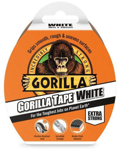 GORILLA Ragasztószalag fehér extra erős 48 mm x 10 m Gorilla Tape Ragasztószalag „A földkerekség legkeményebb munkáihoz48 mm x 10 mVíz és időjárásálló. Elképesztően erős tapadás, durva, egyenetlen felületeken is. Strapabíró minden időjárási helyzetben, ellenáll a nedvességnek, UV sugárzásnakés a szélsőséges hőmérsékletnek. Kézzel téphető. Nem hagy ragasztó