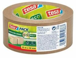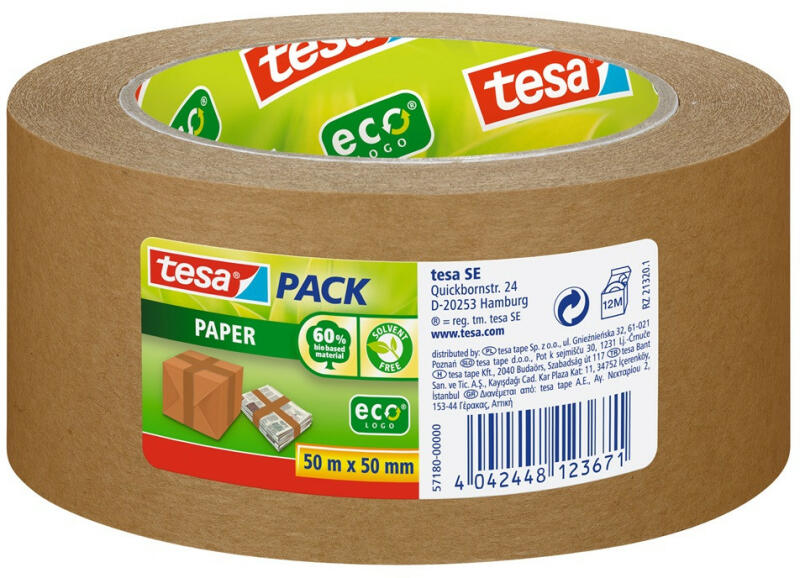 A tesapack® papír csomagolószalag egy környezetbarát kartonlezáró szalag. Magas újrahasznosított száltartalmú, fehérítetlen papírból készült, erős papír hordozóval rendelkezik. A szalag kézzel könnyen téphető, mégis biztonságos lezárást nyújt bármely karton, csomag vagy boríték számára. Oldószermentes ragasztóanyaga mentes bármilyen mérgező vegyi anyagtól. A