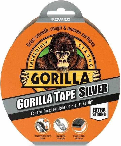 Széles, szürke színű ragasztószalag a legkeményebb munkákhoz, 11 méteres változat Hőálló, 4.8 cm széles ragasztó, amely nemcsak sima, hanem durva és egyenetlen felületeken is megtapad. Szerteágazó felhasználási területekre (pl. foltok elfedése, felfújható matracok javítása stb. ) Hossza: 11 méter. Gorilla Tape ragasztószalag „A földkerekség legkeményebb munkáihoz