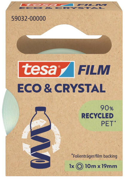 Bemutatjuk a tesafilm® Eco & Crystal szalagot, amely a klasszikus tesafilm® jól ismert tulajdonságait ötvözi a környezetbarát jellemzőkkel. Rendkívül átlátszó, sokoldalú, erős, oldószermentes ragasztóval, és 90%-ban PET-palackok újrahasznosításából származó műanyagból készült hordozóanyaggal. Ezenkívül a tekercs magja 100%-ban újrahasznosított műanyagból k