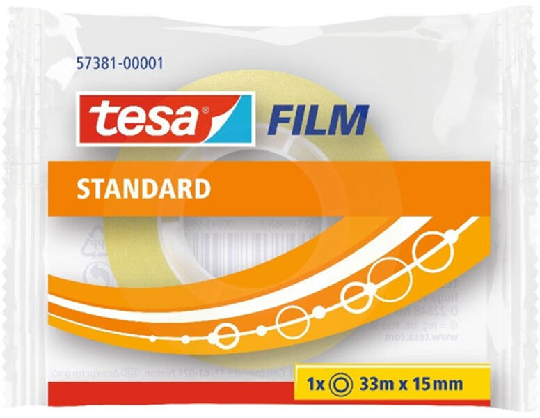 A Tesa standard ragasztószalag az iskolákban, otthonokban és irodákban egyaránt megtalálható öntapadó szalag. Ez egy többcélú, átlátszó szalag a legkülönbözőbb alkalmazásokhoz. Használja kézműves szalagként vagy általános célú irodai szalagként. Ideális papírjavító szalagként vagy ajándékcsomagoló szalagként is. Az átlátszó szalag nem tartalmaz PVC-t és se