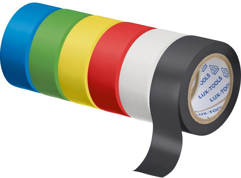 A 6 részes LUX-TOOLS szigetelőszalag-készlet *** 6 db 4,5 m x 15 mm PVC-szalagtekercset tartalmaz. A 6 tekercs különböző színű: 1-1 sárga, vörös, kék, zöld, fekete és fehér.