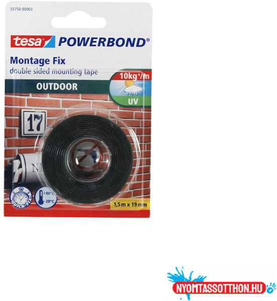 Ragasztószalag 19mmx1,5m UV álló Power Tesa A tesa® Powerbond rögzítőszalag biztonságosan rögzíti a különféle tárgyakat a kemény felületekre. Jó kötési feltételek mellett ebből a nagy teljesítményű rögzítőszalagból elegendő néhány cm-es csík, hogy „nagyobb súlyt megtartson. Használhatja bármilyen kellően kemény, sík felületen, például csempén, fa panelek