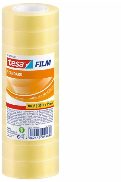 RAGASZTÓSZALAG IRODAI 10 DB, ÁTLÁTSZÓ 15MMX10X33M TESA A tesafilm® standard ragasztószalag a legközkedveltebb szalag, amellyel találkozhatunk az iskolában, otthon és az irodában. Univerzális átlátszó szalag alkalmazások széles köréhez. Használja kézműveskedéshez vagy általános célú irodai szalagként. Papírjavító vagy ajándékcsomagoló szalagként is ideális. Az á