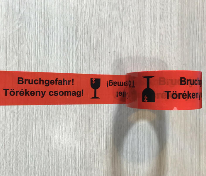 Nyomtatott ragasztószalag. Piros alapon, feketefelirattal. 50/66 típusú. Szendvics technólógiával nyomott feliratos szalag Garantáltan nem válik el a felirat a szalagról! Leírás: "Törékeny" felirattal ellátott nyomtatott ragasztószalag, áruvédelmi jelöléssel ellátva. Adatok: - Méret: 50mm x 66m - Szendvics nyomással készült, kiváló minőségű nyomott szalag