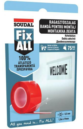 A Fix ALL Átlátszó ragasztószalag egy átlátszó, extra vékony, kétoldalas ragasztószalag, láthatatlan ragasztást biztosít üveg vagy áttetsző felületeken. Ideális gyors és egyszerű tartós rögzítésre különböző anyagok esetén, úgymint üveg, tükör, csempe, kő, acél, legtöbb fém, kezelt fa, furnér és a legtöbb műanyag. Tartós és ellenálló ragasztást biztosí