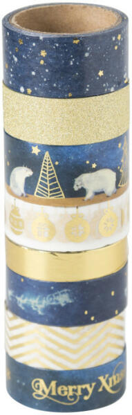 Washi tape Karácsony 3 mtr, 8 db - kék-arany A Washi tape Karácsony - kék-arany készlet darabjaival feldobhatod a csomagolásaidat, de használhatod akár díszítéshez is. Naplódat, Scrapbookodat vagy bármilyen kézműves alkotásodat is különlegessé teheted a kék-arany színű washi tape -ekkel. A készletben 8 db karácsonyi washi tape -et találsz, mindegyik 3 méter hosszú. Washi