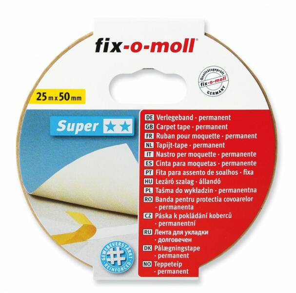 Fix-o-moll Super kétoldalú öntapadó szőnyegragasztó szalagok Super: fokozott igénybevételhez, szöveterősített kivitel Hosszúság: 25 m Szélesség: 50 mm