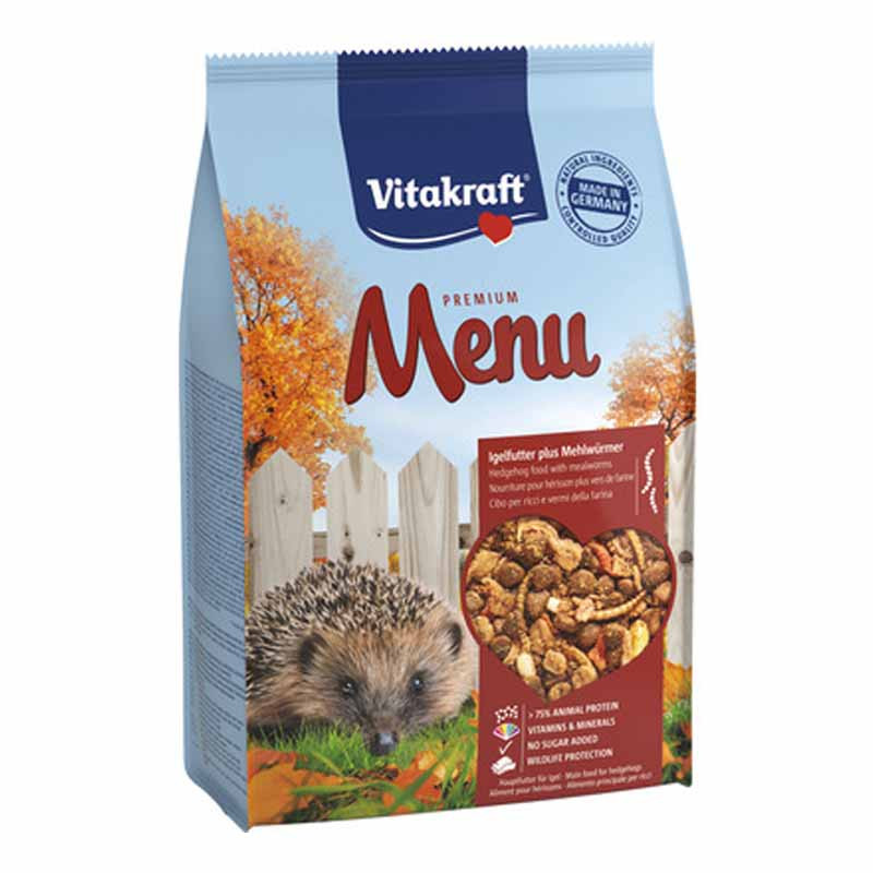VITAKRAFT PREMIUM MENÜ SÜNIKNEK Vitakraft Menü egy hatékony, sokoldalú természetes eledel, amely növeli a túlélési esélyeit az esetlegesen legyengült sünök számára és biztosítja az egészséges táplálkozást. rovarokkal, puhatestűekkel és rákfélékkel diófélékkel és gyümölcsökkel vitaminokkal és ásványi anyagokkal Ez a száraz eledel garantálja az egészséges t