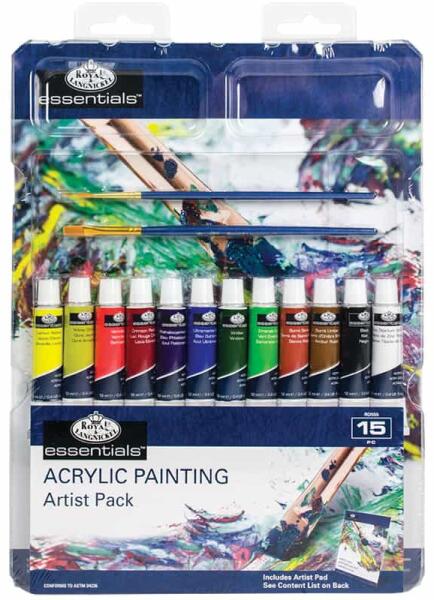 Royal Langnickel akriltömb festékekkel Akrilfestékek tubusban 12 x 12 ml ( Lemon yellow, Yellow ochre, Vermillion, Crimson red, Phthalocyanine, Ultramarine blue, Viridian, Emerald green, Burnt sienna, Burnt umber, Black, Zinc titanium white) 2 db ecset Royal & Langnickel Watercolor Artist Pad 25 lapos, kiváló minőségű papírból álló tömb festéshez bármilyen akrilfestékkel. Kivá