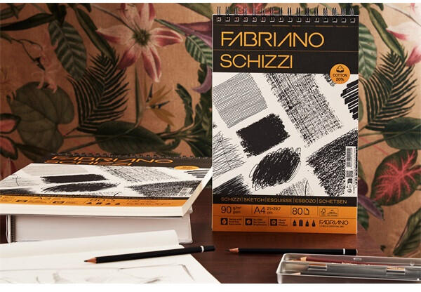 Fabriano Sketch 90 g A4 80 lap spirál rajz- és vázlattömb A Schizzi papír 20% pamutszálat tartalmaz és hagyományos hengeres formázógépen készül. Ez az eljárás megőrzi a kézzel készített papír jellegzetes tulajdonságait, lehetővé téve a szálak finom és véletlenszerű szétterülését, hogy puha és homogén papírlapot kapjunk. Így a lapok erősebbek és ellenállóbbak