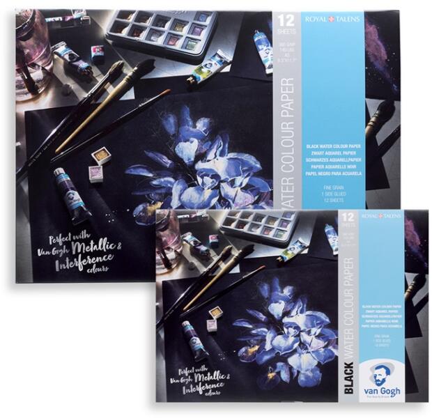 Fekete akvarell papírblokk Van Gogh / 12 lapos | különböző formátumok A fekete akvarell papírblokk Van Gogh ideális lenyűgöző művek megfestésére fekete alapon. A festőtömb fekete papírján még jobban kiemelkednek a metalikus és a neon színek. A papír hidegen sajtolt magas minőségű 100 százalékos cellulózból készült. A papír erős, tartós, finom szerkezetű és savme