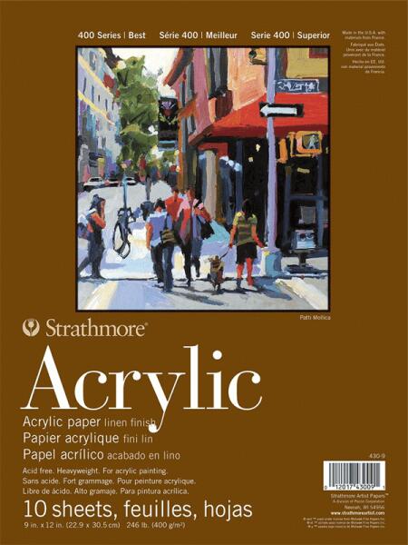 Strathmore Acrylic 22,9x30,5cm 400g 10 lap Nagy grammsúlyú papír finom felületi struktúrával, ideális az akrilfestményekhez. Jellemzés: A papírlapokat oldalt ragasztó tartja össze. A borítékot ki lehet hajtani. Méretek: 22,9x30,5cm Papír súlya: 400g/m2 száma: 10 lap