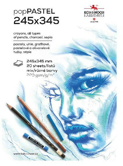 Rajzfüzet KOH-I-NOOR 9920 245x345 mm 20 lapos pasztell színes Speciális papírból gyártott, pasztell, szén, grafit, színes ceruzával készített rajzok és aquarell festmények készítésére alkalmas színes lapos vázlatfüzet 20 db 245 x 345 mm méretű lapot tartalmaz (220 g/m2).