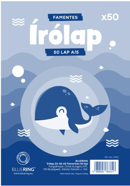 ÍRÓLAP 20-50 A5 FAMENTES 80GR 50LAP BLUERING Óvodai és iskolai felhasználásra javasolt írólap famentes és félfamentes alapanyagból. Katalóguskód: 21692GPSR: Orink Hungary Kft. ; H-1151 Budapest, Károlyi Sándor út 160. ; info@orinkhungary. hu; https://orink. hu/