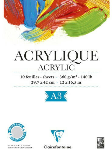 Művészeti rajztömb Clairefontaine Acrylic A/3 10 lap 360g ragasztott fehér Méret: A/3, Alapanyag súlya: 360g/m2 10 lapos Clairefontaine művészeti rajztömb, mely akrilfestékkel történő használathoz lett kifejlesztve, de gouache festékhez is alkalmas. Ideális stúdió és szabadtéri használatra egyaránt. Viszonylag sima felületű és vastag papírból készült, egyik oldalon rag