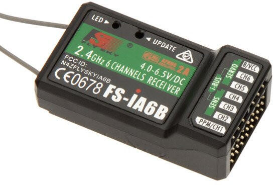 FlySky vevő FS-iA6B, 6 csatorna AFHDS 2A FlySky FS-i A6B vevő A vevő kompatibilis számos FlySky adóval, beleértve az FS-i4, FS-i6, FS-i8 és FS-i10 készülékeket. GyártóFlySkyModellFS-iA6BPWM csatorna6Vezeték nélküli frekvencia2.4GHzVezeték nélküli protokollAFHDS 2AHatótávolság500 ~ 1500m (levegőben)Antenna típusaKettős rézantenna (150mm * 2)Tápegység4.0-6.5VRSSITámogat