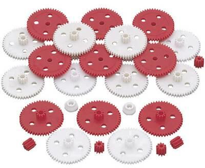 Fogaskerék sorozat modul 0,5 Jellemzők: 20 kettős fogaskerék, 50/10 foggal, furat 2,9 mm · 20 kettős fogaskerék, 50/10 foggal, furat 3,1 mm · 8 kis fogaskerék 10 foggal, furat 1,9 mm · 4 beállító gyűrű. Műszaki adatok: Anyag: műanyag · Modul: 0,5
