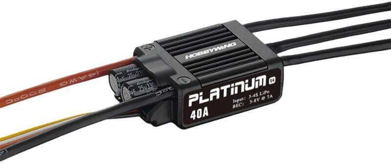 Szabályozó Hobbywing Platinum 40A V4 PLATINA-40A-V4 A PLATINUM-40A-V4 sebességszabályozót váltóáramú (AC) meghajtású repülőgép- és helikoptermodellekhez tervezték. A szabályozó 40A állandó áramot és 70A maximális csúcsáramot biztosít, így stabil és hatékony áramellátást biztosít még a legnehezebb körülmények között is. A NiXX (10-12 cellás) és LiXX (3-4 cel