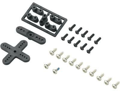 1:8 szervokar készlet Műszaki adatok: Anyag: Műanyag · Furatok száma: 3 · Szín: Fekete · Tartalom: 1 készlet · … szervóhoz: Futaba szervokar koszorúval Szállítás tartalma: 2 szervo szarv · 2 szervo csavar (műanyag-/fém meghajtás) · 4 műanyag tartó · 10 rögzítő csavar.