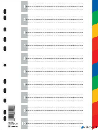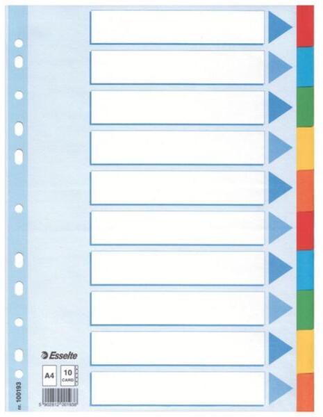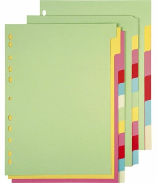 Méret A4 Anyag karton Szín kék és árnyalatai Újrahasznosított Igen Elválasztás alapja szám alapú - lefűzött dokumentumok kategorizálására - színes - újrahasznosított, 250 g/m2 kartonból készült - mikroperforált fülek - 4 lefűzőlyuk - méret: 235x300 mm