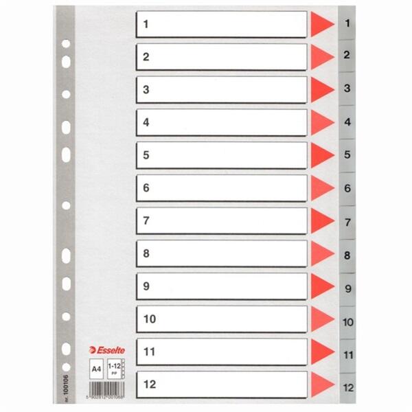 Regiszter, karton, A4, 12 részes, írható előlappal, Esselte Standard, színes - tartós elválasztólap élénk színkombinációkban - újrahasznosított, Blue Angle minősítéssel rendelkező karton alapanyag - nagyméretű téglalapok az előlapon a tartalom feltüntetésére - megerősített lefűzőrész az előlapon