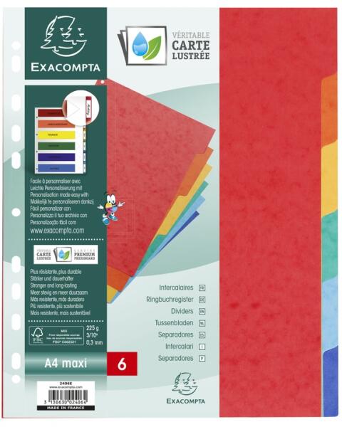 Exacompta elválasztó lapok (A4, Maxi, 6 színű) 6db/csomag A4 Maxi formátum: A4+ méretű elválasztólapok Ideális A4+ méretű mappák rendszerezéséhez A füles elválasztó lapok rugalmas, 225 g/m2 valódi fényes kartonból készültek A valódi fényes karton természetes, fenntartható és tanúsított A valódi fényes karton erősebb és ellenállóbb, mivel új szálakból készül