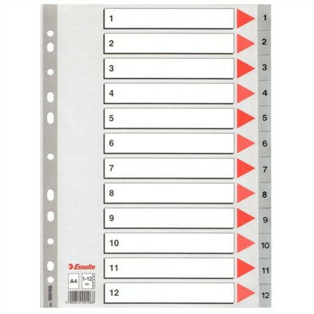 Regiszter, műanyag, A4, 1-12, ESSELTE, szürke - a minőségi műanyag alapanyagból készült regiszterek az iratok hatékonyabb és időtállóbb rendszerezését és visszakeresését szolgálják - 11 lefűzőlyukkal rendelkeznek - méret: A4 - szürke szín