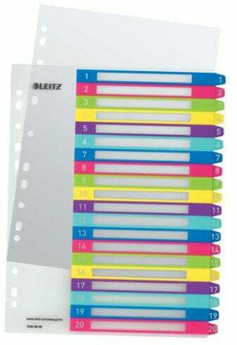 -vegyes színű regiszter -nagyméretű téglalapok az előlapon a tartalom feltüntetésére -1-20 felirattal rendelkező regiszter fülek a dokumentumok gyors eléréséhez -nyomtatható tárgymutató az egyedi igényekhez -megerősített lefűzőrész az előlapon hagyományos, 11-lyukú lefűzőrész -0,3 mm vastag PP alapanyag -az A4+ méret elválasztólapok regiszter része szélesebb, mint