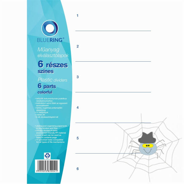- tartós elválasztólap élénk színkombinációkban- 10 színes fül a könnyű rendszerezéshez - hagyományos, 11-lyukú lefűzőrész - Blue Angel minősített, újrahasznosított karton alapanyag- erős, 160 g-os karton alapanyag