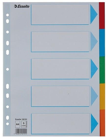 Regiszter ESSELTE Standard A/4 karton 5 részes Tartós elválasztólap élénk színkombinációkban. Újrahasznosított, Blue Angle minősítéssel rendelkező karton alapanyag. Nagyméretű téglalapok az előlapon a tartalom feltüntetésére. Megerősített lefűzőrész az előlapon 5 színes fül a könnyű rendszerezéshez Hagyományos, 11-lyukú lefűzőrész A4 méret Erős, 160 g-os kar