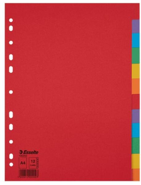 Tartós elválasztólap élénk színkombinációkban. Újrahasznosított karton alapanyag. 12 színes fül a könnyű rendszerezéshez. Hagyományos, 11-lyukú lefűzőrész. A4 formátum. Erős, 160 g-os karton alapanyag. Blue Angel minősített, újrahasznosított karton alapanyag. Blue Angel minősített, újrahasznosított karton alapanyag.